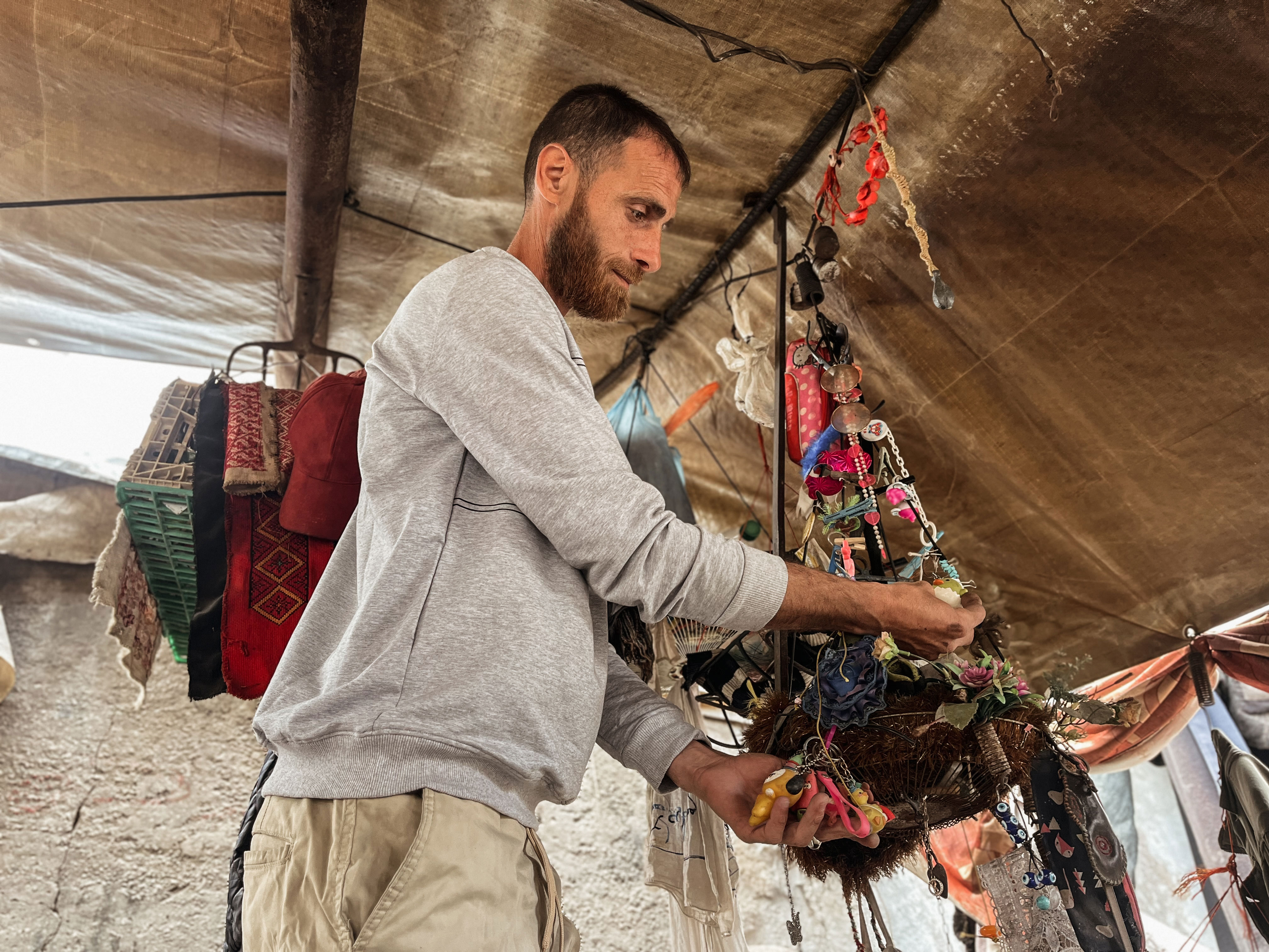 قام بتعليق هذه البقايا الصغيرة خارج خيمته، إلى جانب قطعة قماش بيضاء تحمل أسماء عائلته المفقودة، مثبتة على ما تبقى من جدار محطم.