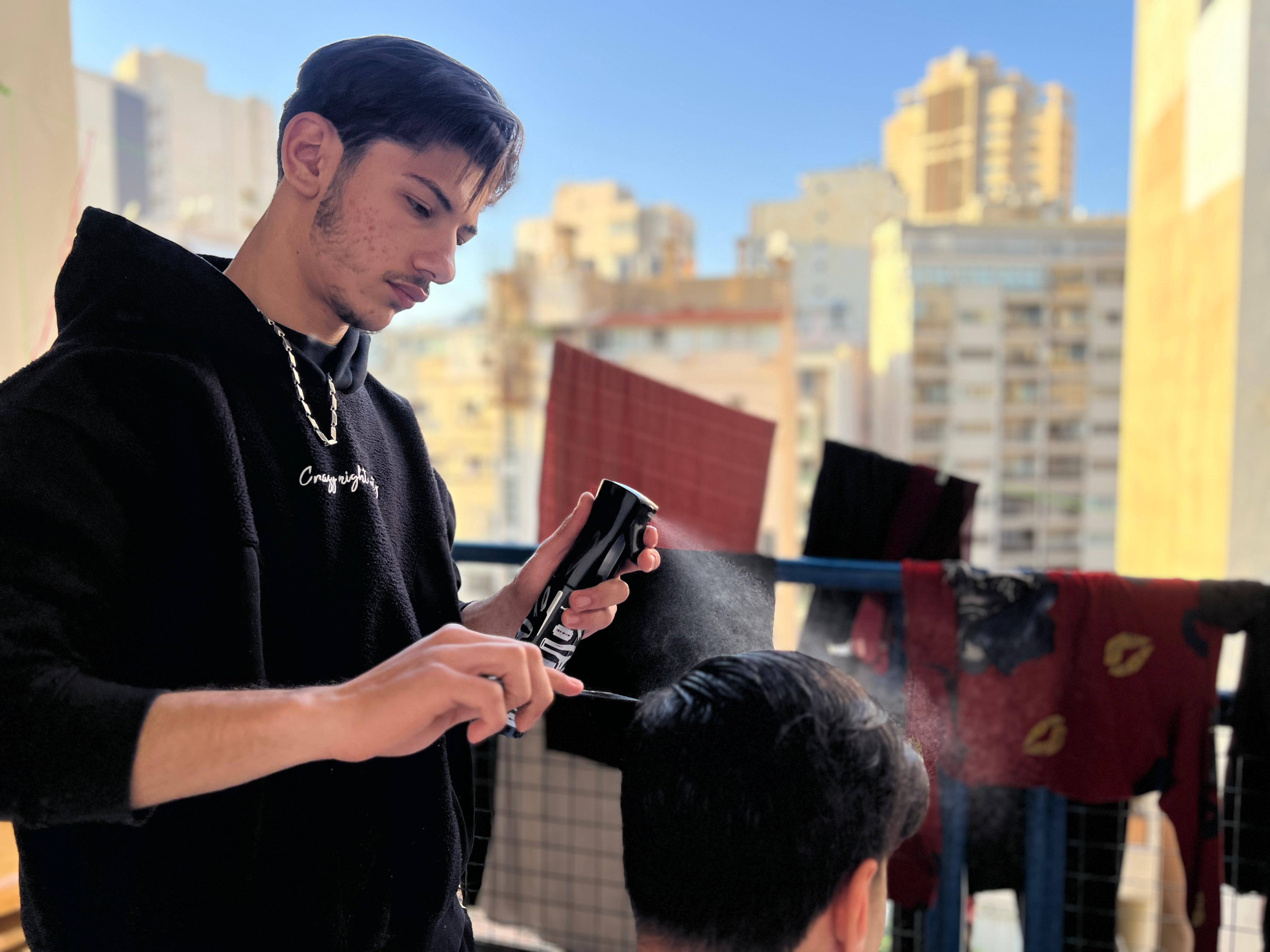In a long corridor inside one of the shelters in Beirut, Ali Hassan Lzein stands behind a simple chair, holding a comb and scissors. To his left is a metal railing where pieces of clothing hang, spread out to dry under the sun, while small locks of hair fall quietly onto the floor. There is no large mirror, no fully equipped salon like the one he was used to—still the work continues.