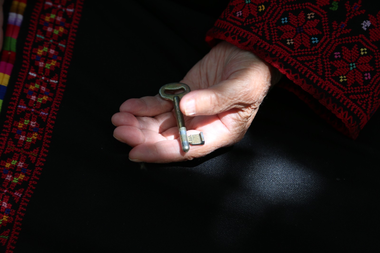 Ghalia Muqbil, 87, lives in Al-‘Arrub Camp near Hebron. She was displaced from Iraq al-Manshiyya and still keeps her house key and belongings from the time.